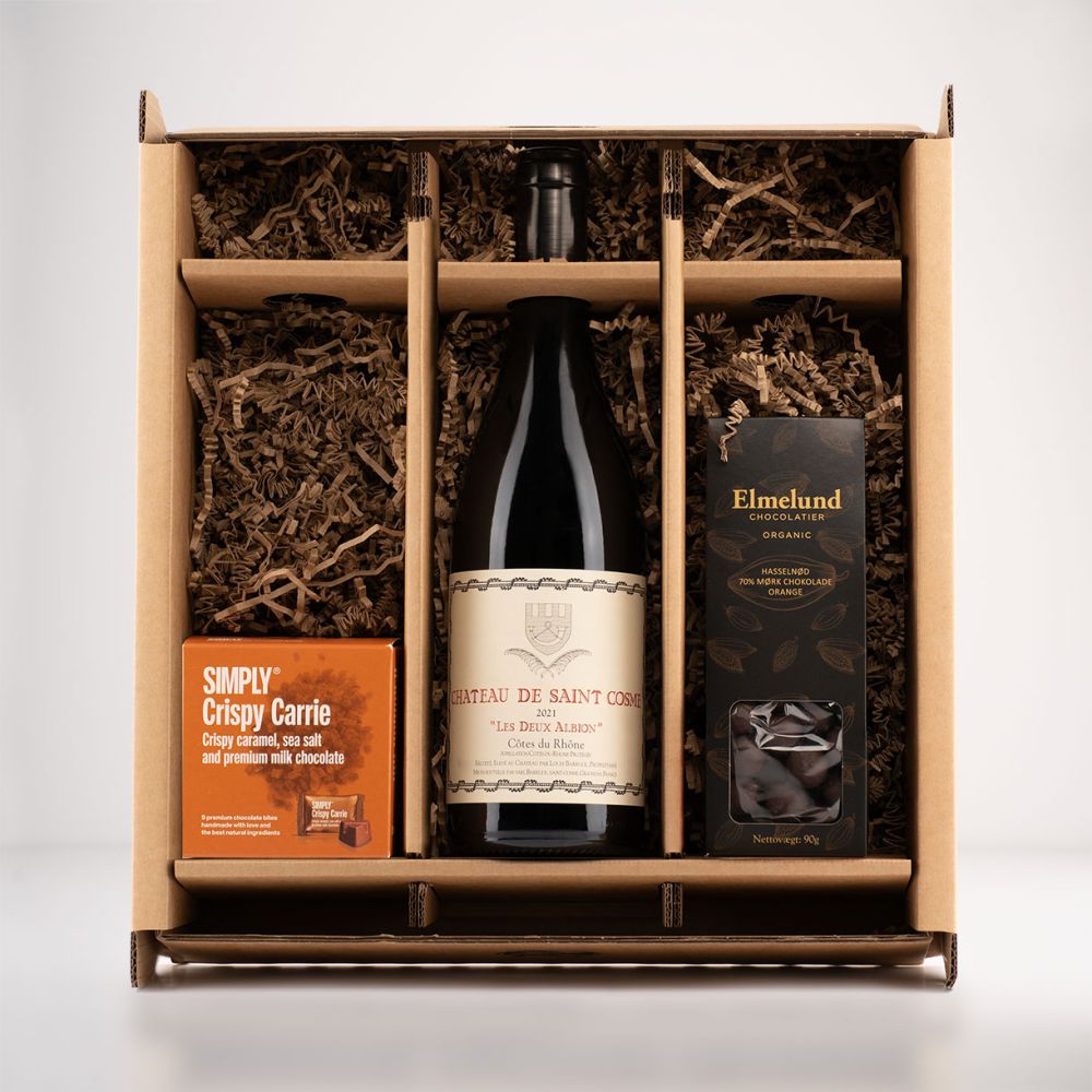 Côtes du Rhône Les Deux Albion er lavet på en blanding af Syrah, Grenache, Carignan, Mourvèdre og Clairette. fra de tre Côtes-du-Rhône-Villages kommuner Plan de Dieu, Saint Maurice og Cairanne, hvor druerne bliver dyrket langs skråninger med jordbunde bestående af ler, småsten og kalk.
